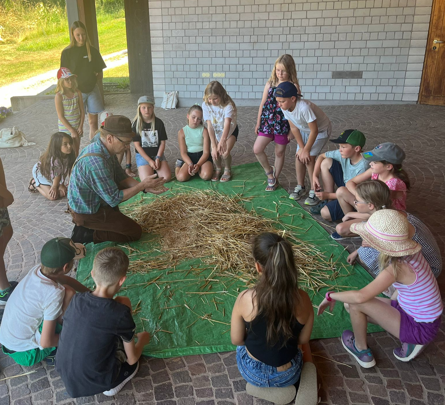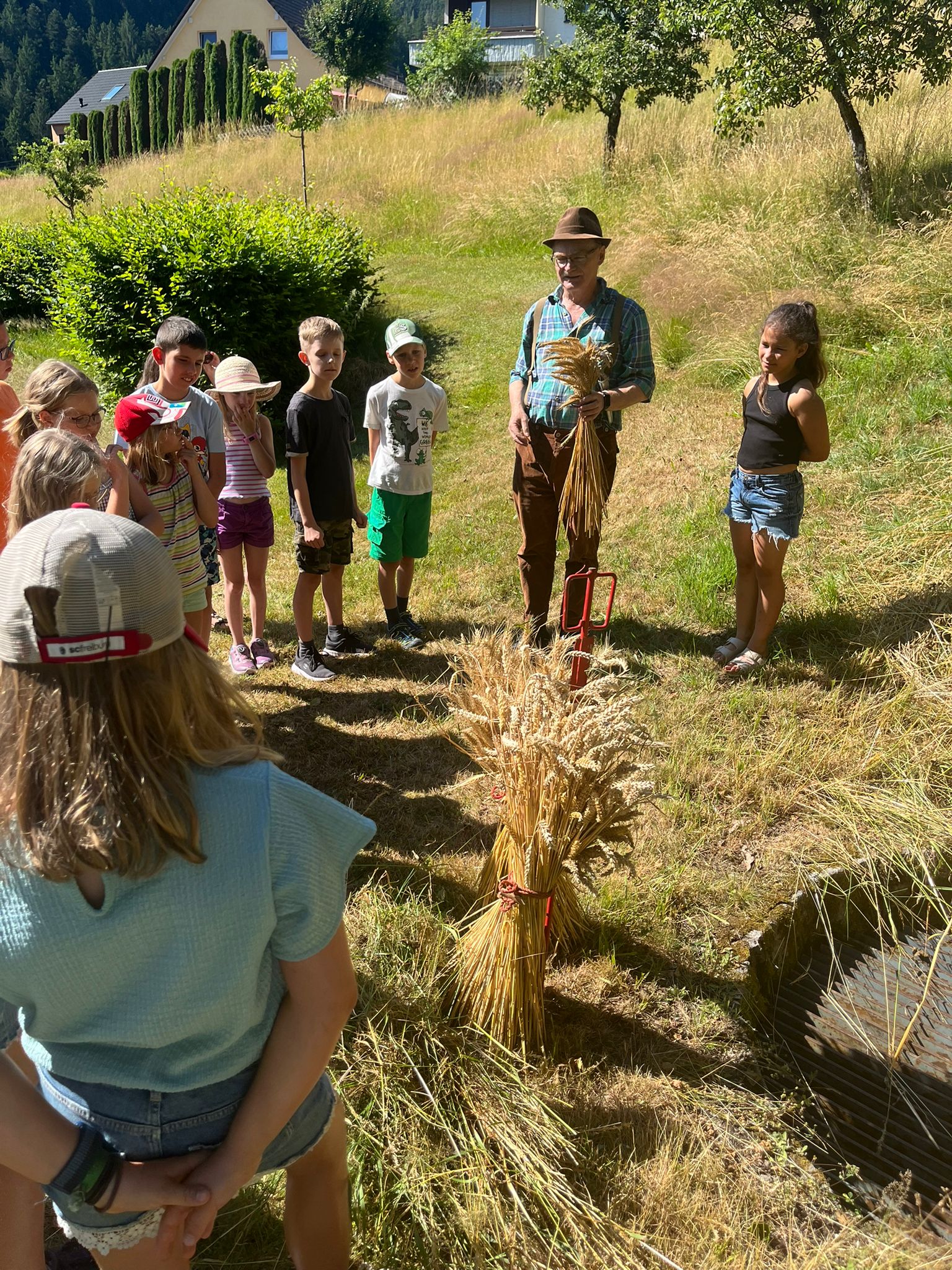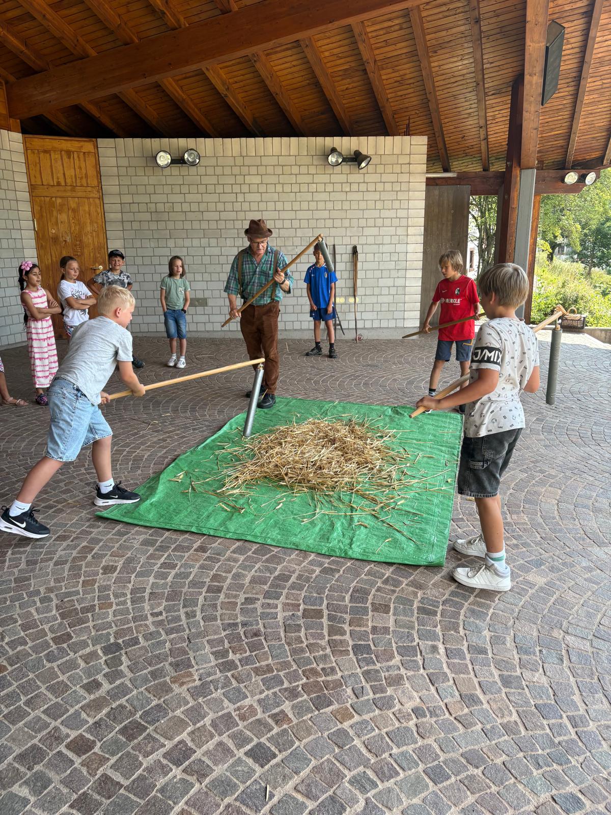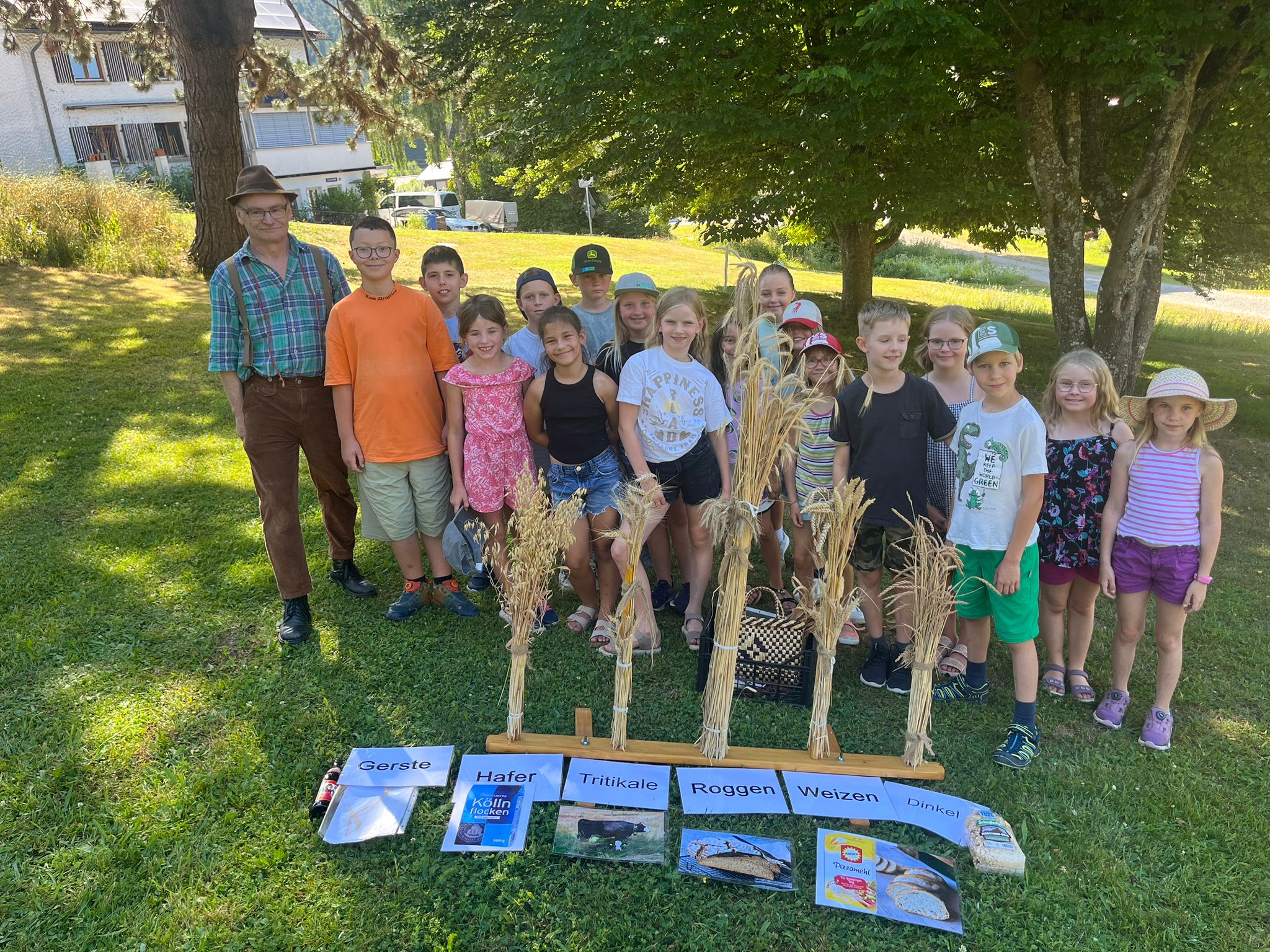 Das Mehl für den Kuchen kommt heutzutage meist aus der Tüte und die Tüte kommt aus dem Supermarkt – aber woher kommt das Mehl? Die Kinder unserer dritten Klassen durften in der vergangenen Woche ganz praktisch erleben, wie vor etwa 100 Jahren der Weg vom Korn zum Mehl verlief: Während einer Mühlenführung mit „Bauer Anton“ (Martin Grieshaber) lernten sie verschiedene Getreidesorten kennen und durften mit Dreschflegeln selbst das Korn aus den Ähren schlagen.