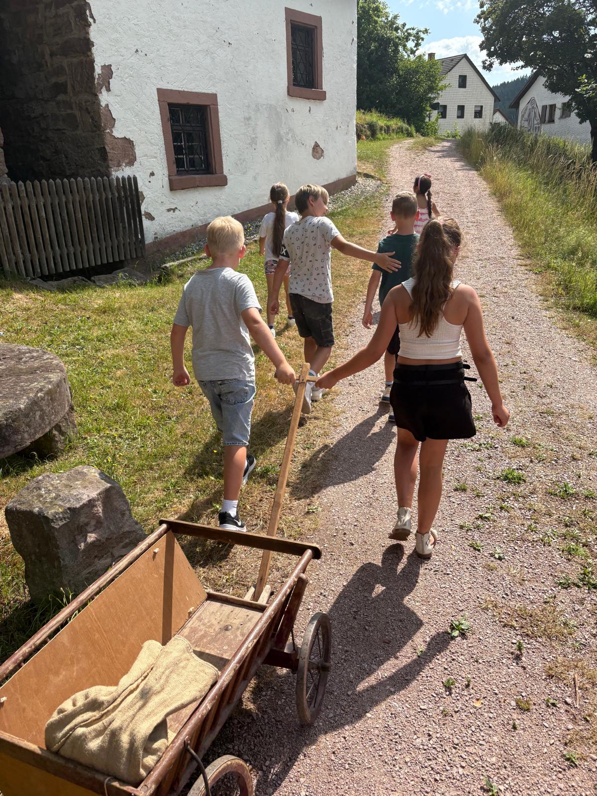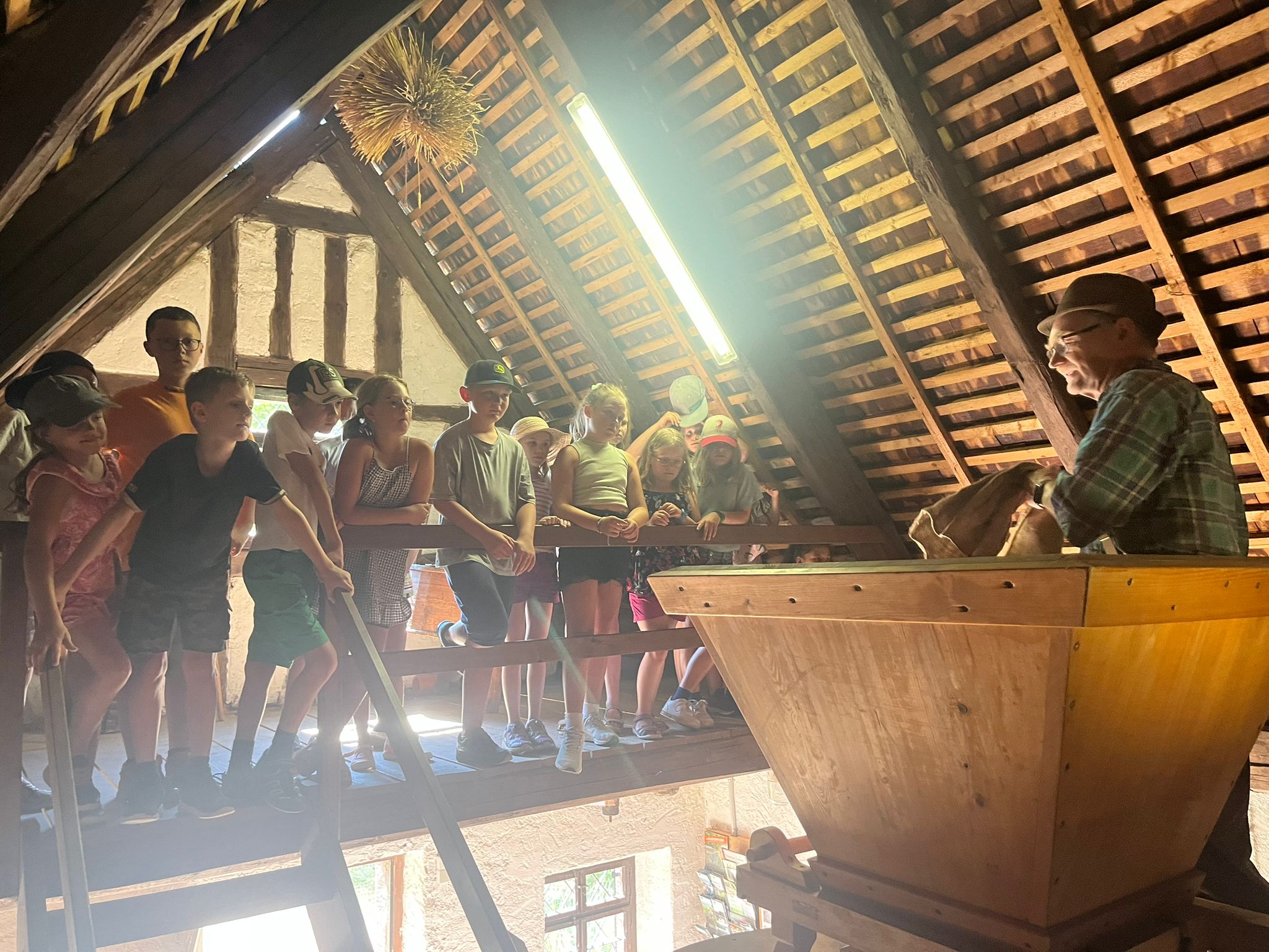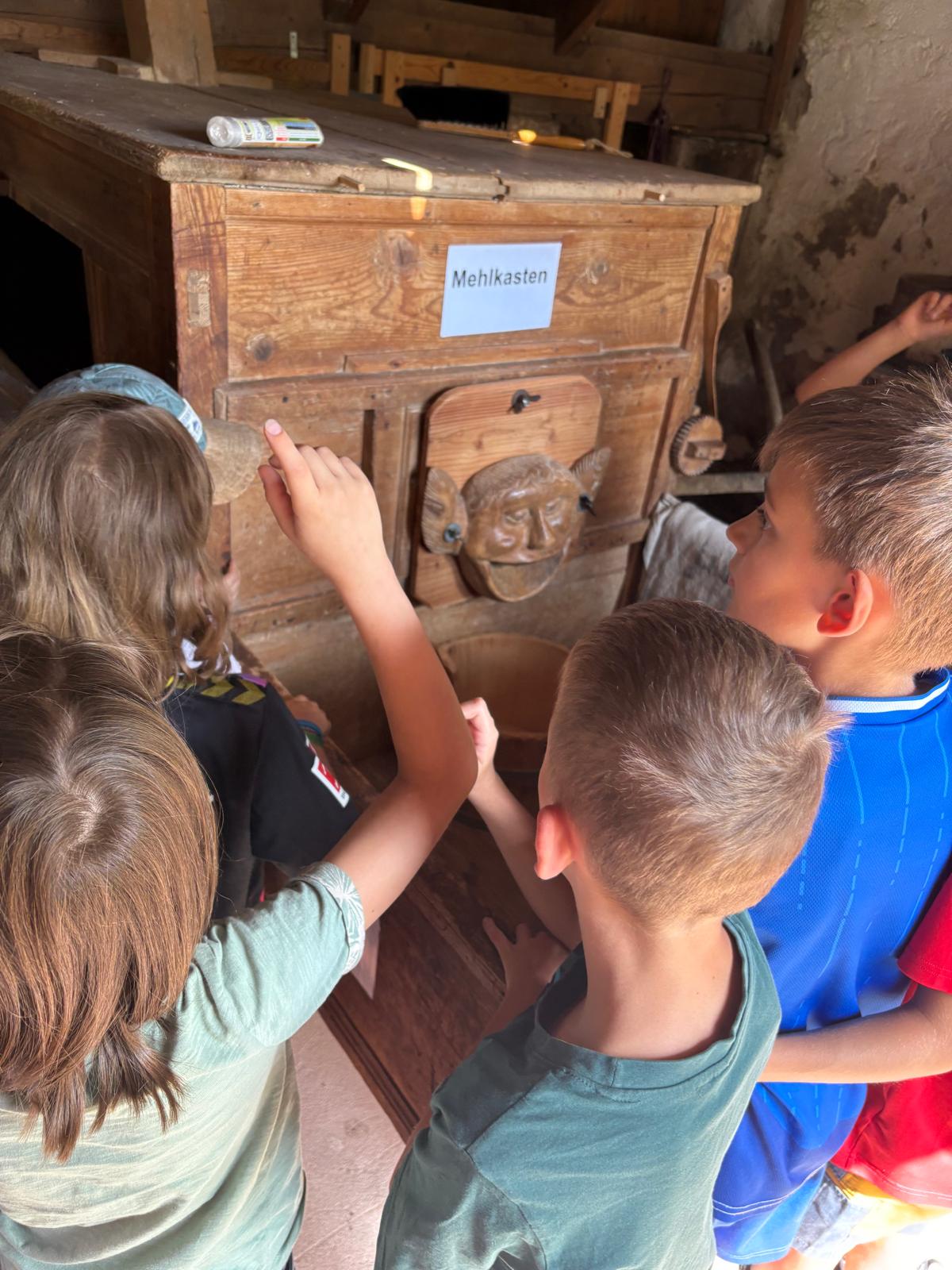 Anschließend wurde die Wiesenbauernmühle in Betrieb genommen und das Korn mithilfe von Wasserkraft zu Mehl gemahlen. Besondere Freude bereitete den Kindern dabei der „Kleiekotzer“, ein aus Holz geschnitztes Gesicht, das die Kornreste „ausspuckt“. Vielen Dank an Martin Grießhaber für diese tollen und anschaulichen Führungen!